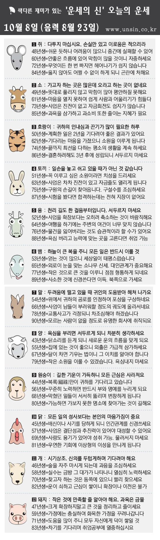 [띠별 오늘의 운세] 2012년 10월 8일 월요일(음력 8월 23일)