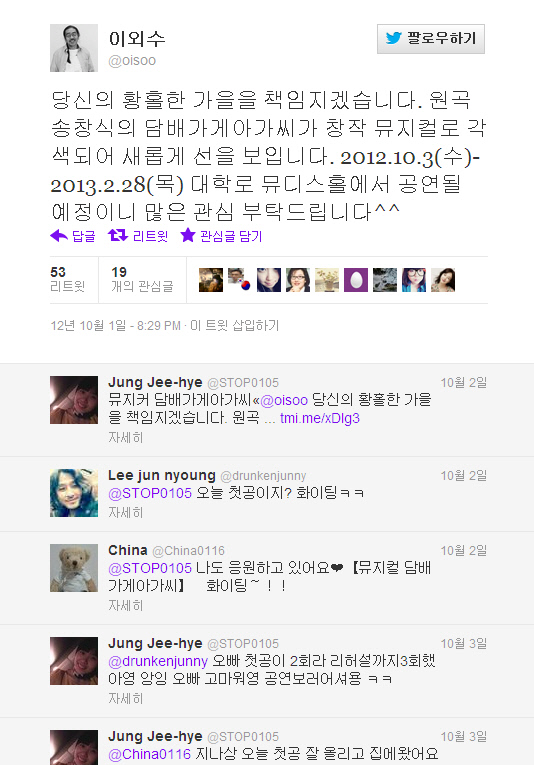 이외수는 최근 자신의 트위터에 "당신의 황홀한 가을을 책임지겠습니다. 원곡 송창식의 담배가게아가씨가 창작 뮤지컬로 각색되어 새롭게 선을 보입니다. 2012.10.3(수)-2013.2.28(목) 대학로 뮤디스홀에서 공연될 예정이니 많은 관심 부탁드립니다^^"라는 글을 올려 트위터들의 뜨거운 호응을 받은 바 있다.
