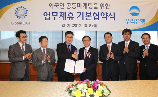 우리은행(은행장 이순우)이 8일 서울 회현동 소재 우리은행 본점에서 글로벌블루코리아(한국지사장 최원범)와 외국관광객들이 우리은행 일반 창구에서 부가세 환급을 받을 수 있도록 지원하는'외국인 공동마케팅을 위한 업무제휴 기본협약'을 체결했다.