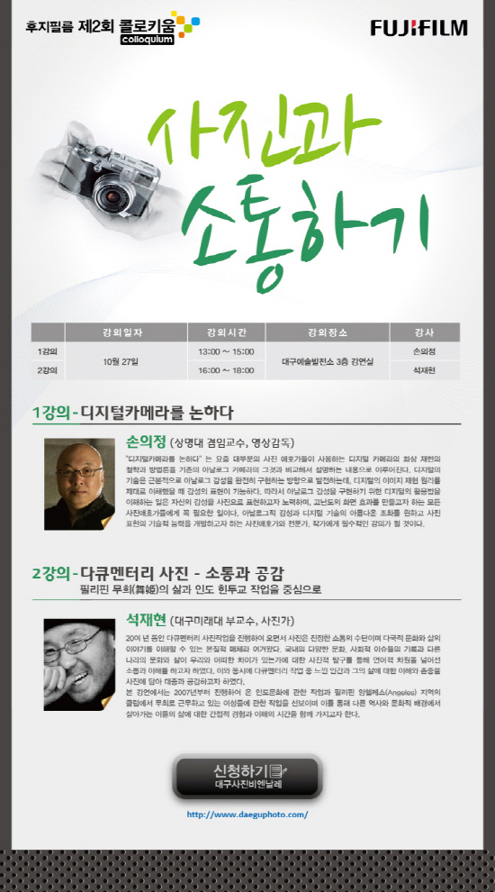 10월 27일 오후 1시부터 6시까지 2가지 주제로 구성된 사진 전문 강좌 또한 주목할 만하다. 첫 번째 강좌는 '디지털 카메라를 논하다' 는 주제로 오후 1시부터 3시까지 상명대 겸임교수이자 영상감독인 손의정 교수가 진행하며, 두 번째 강좌는 '소통과 공감'이라는 주제로 대구미래대 부교수이자 사진가인 석재현 교수가 진행한다. 후지필름은 이번 강좌와 제품 체험존 운영을 통해 사진과 카메라, 그리고 대중이 함께 교감할 수 있는 유익한 자리가 될 것이라 기대하고 있다. 후지필름 일렉트로닉 이미징 코리아 관계자는 "앞으로 후지필름의 모토 그대로, 인생에 찍는 즐거움을 많은 이들에게 선사하고 사진 예술 문화에 앞장 설 수 있도록 더욱 노력할 것" 이라고 말했다. 김세형 기자 fax123@sportschosun.com