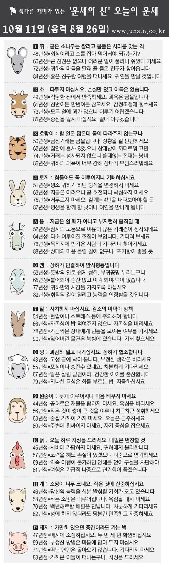 [띠별 오늘의 운세] 2012년 10월 11일 목요일(음력 8월 26일)