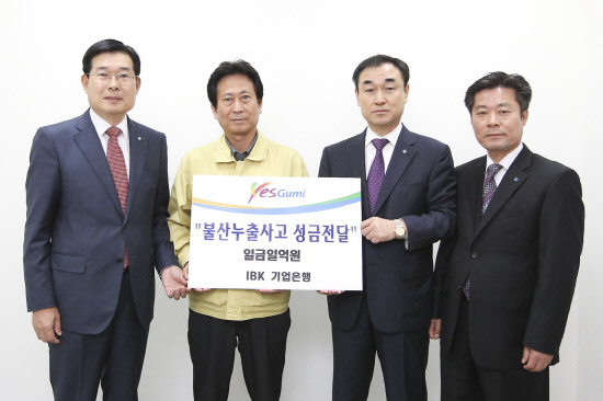IBK기업은행(www.ibk.co.kr)이 11일 경북 구미시청을 방문해 불산가스 누출사고 피해 주민 지원을 위한 성금 1억원을 전달했다. 후원금은 불산가스 사고 현장 복구와 이로 인해 어려움을 겪고 있는 주민들을 위해 사용된다. 사진 왼쪽부터 박춘홍 IBK기업은행 기업고객본부장, 박상우 구미시 주민생활 지원국장, 정환수 IBK기업은행 경영전략본부장, 류재봉 대구·경북지역본부장. 박재호 기자 jhpark@sportschosun.com