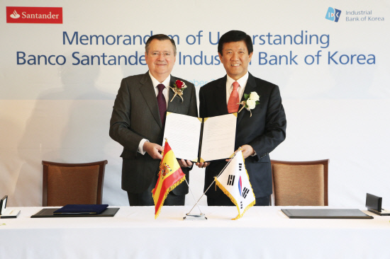조준희 기업은행장(사진 오른쪽)과 알프레도 사엔츠 산탄데르은행장은 이날 상호협력 및 교류에 사인했다. 기업은행은 중소기업의 해외진출 지원을 위해 글로벌 네트워크를 구축하기 위해 최근 도이치방크와 호주 ANZ은행 등 세계 주요 은행과 잇달아 업무협약을 체결했다. 다음 달엔 중국은행(bank of china)과 협약을 맺는다. 박재호 기자 jhpark@sportschosun.com