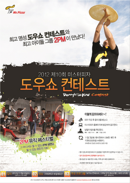 글로벌외식문화기업 MPK그룹(대표이사 문영주)의 피자업계 베스트브랜드인 미스터피자(www.mrpizza.co.kr)는 오는 11월 3일 개최되는 '2012 미스터피자 제10회 도우쇼 컨테스트'의 결승전 티켓 증정 이벤트를 진행한다.