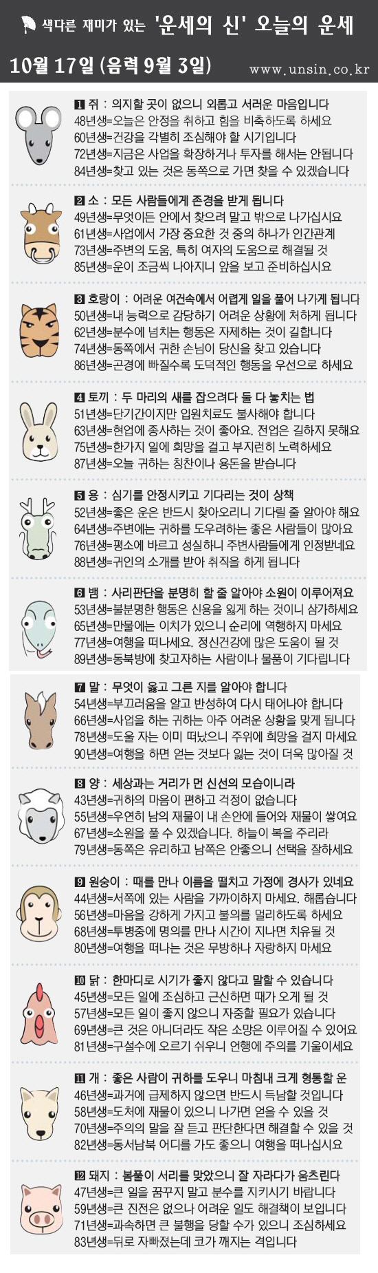[띠별 오늘의 운세] 2012년 10월 17일 수요일(음력 9월 3일)