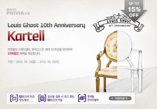 나만의 개성있는 힐링 하우스를 계획 중인 고객이라면 현대카드 프리비아 쇼핑(http://shop.hyundaicard.com)에서 진행하는 리빙 인테리어 기획전을 주목해 보자. 발품을 팔지 않고도 모던하면서도 감각적인 제품을 합리적인 비용으로 구입할 수 있는 기획전이 다양하게 열린다. 내달 16일까지 진행하는 '인테리어 스타일 제안전'으로는 최고 50%의 혜택을, 오는 31일까지 진행하는 '루이고스트 10주년 할인 기획전'은 카르텔 제품을 최고 15% 할인가에 제공한다.