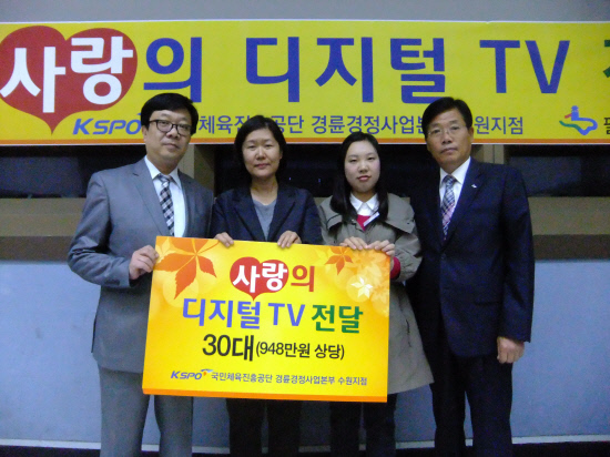 국민체육진흥공단(이사장 정정택) 경륜경정사업본부 수원지점은 최근 4층 고객홀에서 '사랑의 디지털 TV 전달식'을 가졌다.