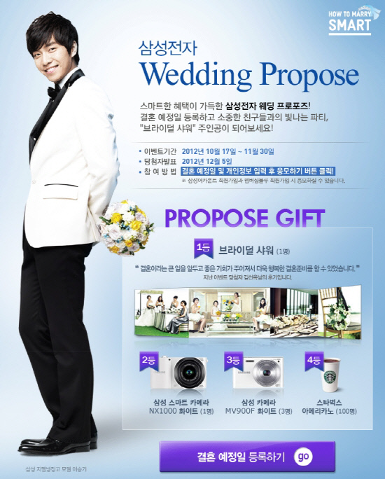 삼성 웨딩 프러포즈는 푸짐한 경품을 증정하는 온라인 이벤트와 혼수 마련 시, 실질적인 구매 혜택을 누릴 수 있는 오프라인 이벤트로 진행된다. 온라인 이벤트는 삼성전자 닷컴 사이트(www.samsung.com/sec) 내 마련된 이벤트 페이지에서 삼성전자 멤버십 블루에 가입하고 결혼예정일을 등록하면 추첨을 통해 브라이덜 샤워 혜택은 물론 푸짐한 경품으로 제공받을 수 있다. 해당 이벤트는 오는 11월 30일까지 멤버십 사이트에서 응모 가능하다.