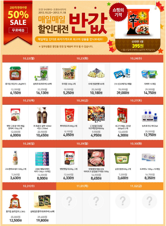 정원e샵은 리뉴얼 오픈과 함께 이를 기념하기 위한 반값 할인 이벤트도 내달 18일까지 함께 진행한다. 매일 3가지 제품을 각각 200개씩 50% 할인된 가격으로 판매하는 것. 이에 따라 청정원 '우리팜델리', 종가집 '고추장 더덕매실 장아찌', 아모레퍼시픽 '려 흑운모 샴푸', 농심 '신라면' 등이 판매될 예정이다.