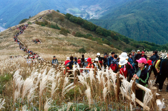 | 이맘때 계절의 낭만을 잘 담아내는 또 다른 테마가 있다. 바로 억새다. 한껏 부푼 아이보리 빛 억새가 가을바람에 일렁이는 능선의 모습이란 차라리 한 폭의 그림이다. 사진은 정선 민둥산 억새구경 행렬<사진=국립휴양림관리사무소 제공> |