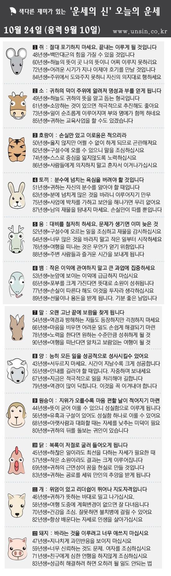[띠별 오늘의 운세] 2012년 10월 24일 수요일(음력 9월 10일)