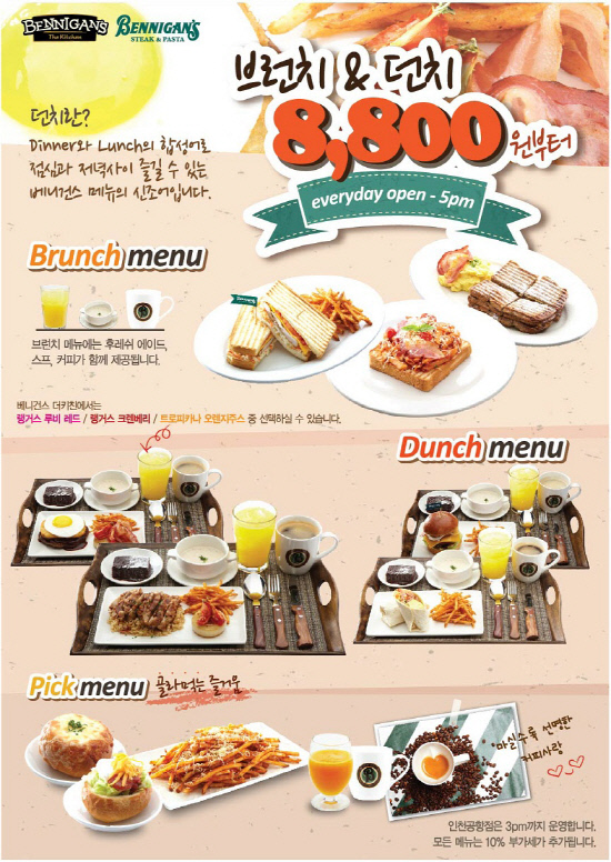 베니건스에서 선보이는 브런치&던치는 정시에 맞춰 식사를 하지 않는 요즘 세대의 라이프스타일에 따라 아점(아침과 점심사이) 개념의 브런치와 점저(점심과 저녁사이) 개념의 던치로 구성했다.