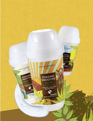 네이처리퍼블릭의 '쉐이킹 스무디 마스크'(7g*6, 9900원)는 직접 갈아 넣은 천연 파우더를 물과 함께 섞으면 겔 타입 마스크 팩이 만들어지는 제품이다. 캘리포니아산 알로에와 지중해에서 재배된 레몬, 보성 녹차 등 3종으로 출시됐다. 내장된 용기에 표시된 선까지 물을 담은 뒤 파우더 1포를 넣고 뚜껑을 닫은 후 흔들면 갤 마스크 팩으로 변한다. 원하는 각종 미네랄 워터에 섞을 수도 있으며 물 온도를 이용해 피부 컨디션에 따라 차갑거나 미지근하게도 사용 할 수 있는 점이 재미있다는 평가다.