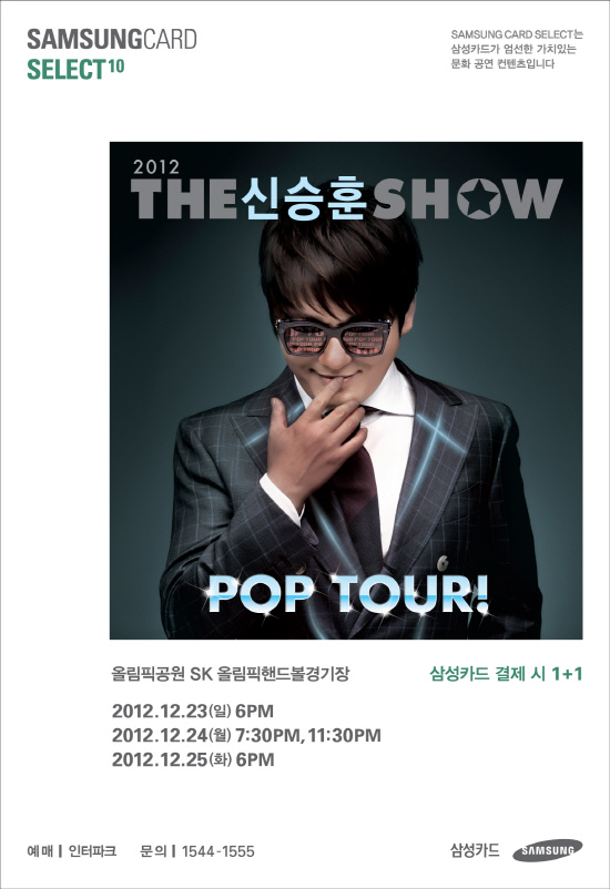 '삼성카드 셀렉트 10 THE 신승훈 SHOW'는 크리스마스 시즌인 ▲12월 23일 오후 6시 ▲12월 24일 오후 7시 30분 / 11시 30분 ▲12월 25일 오후 6시에 총 4회 공연이 올림픽공원 SK핸드볼경기장에서 진행된다.