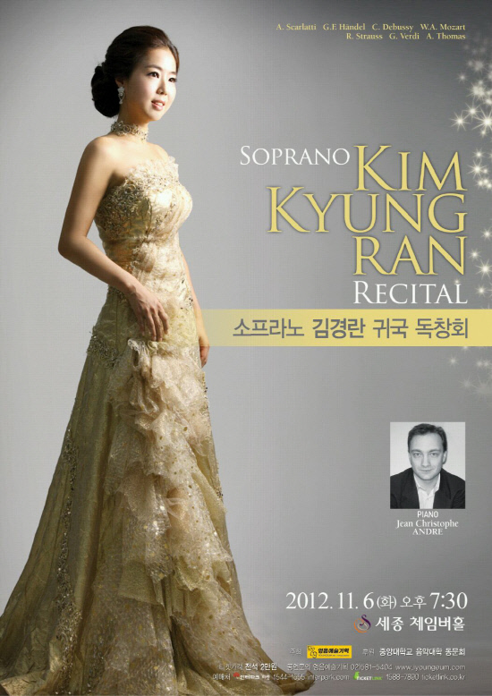 천상의 목소리 소프라노 김경란 귀국 독창회 11월 6일 오후 7시 30분 세종체임버홀에서맑고 청아한 목소리로 음악계 전반에서 주목받고 있는 소프라노 김경란이 오는 6일 오후 7시 30분 세종체임버홀에서 특별한 귀국 첫 무대를 선사한다.