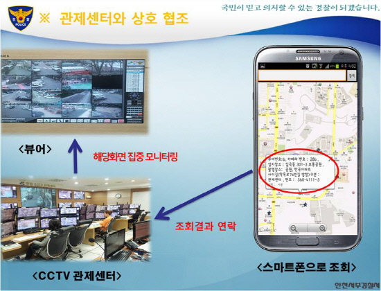 또한 평상시에도 112순찰차나 강력팀 형기차가 강력사건 발생지역(발생우려지역) 순찰 중 스마트폰에 표시된 주변 CCTV번호를 관제센터에 알려주면 관제센터에서 해당 CCTV를 집중 모니터링을 하게 되어 범죄취약시간, 장소에 대한 CCTV 모니터링이 강화되어 범죄발생시 검거가 극대화된다.
