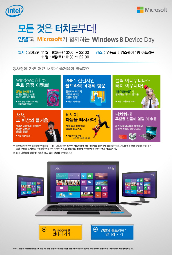 9일 오후 1시부터 시작하는 행사는 누구나 참여할 수 있다. 행사장 입장객 가운데 선착순 300명에게는 체험존 랠리 카드를 완성할 경우 윈도우 8 정식판이 무료로 증정할 예정. 윈도우 8 앱(App) 컨테스트, 개그콘서트의 인기코너 '멘붕스쿨' 팀의 개그 퍼포먼스 및 레크레이션, 그리고 터치 기반 윈도우 8 디바이스를 활용한 비보이 공연 등 다양한 공연도 준비됐다. 또 인텔®의 울트라북™ 체험존에서는 방문객을 대상으로 터치홀릭 이벤트도 상시 운영된다. '터치홀릭' 게임기의 화면을 터치하는 방식으로 조작을 하여 뽑은 터치큐브의 내용에 따라 2NE1의 친필사인이 들어간 울트라북과 버니맨 USB 메모리, 울트라북 노트 등의 푸짐한 선물이 경품으로 제공된다. 이밖에 퀴즈 이벤트, 포토 이벤트 등 다양한 상설 이벤트가 행사 기간 동안 지속돼 윈도우 8을 알아가는 즐거움을 더할 예정이다.