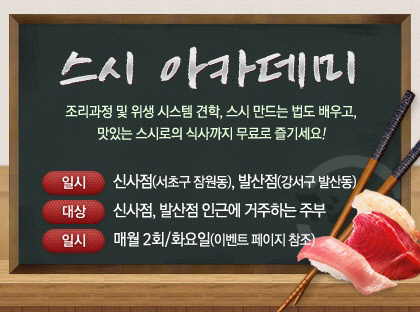 스시 아카데미는 스시로 홈페이지(www.sushiro.co.kr)를 통해서 주부라면 누구나 신청할 수 있으며, 11월7일부터 신청 접수를 받는다. 아카데미 참석자가 스시로 영업점에 재방문할 경우, 스시 6피스와 에이드 한잔을 무료로 제공하는 혜택(테이블당 1매사용)도 1년간 주어진다. 횟수는 무제한이다.