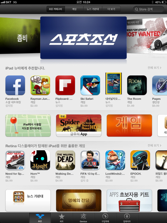 스포츠조선 아이패드앱(이하 스포츠조선 앱)이 애플 앱스토어의 대표 뉴스앱으로 선정되면서 국내 처음으로 앱스토어 초기화면 추천앱으로 등재되었다.
