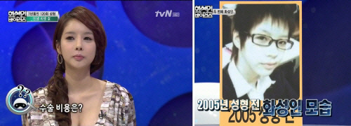 유난히 작은 얼굴과 또렷한 눈코로 인형 같은 미모를 자랑한 그녀는 성형비용으로 약 1억원을 소요하였다며 이경규, 김구랑 등 mc 등을 경악하게 했다. 현재는 치아교정 중으로 약간은 어색한 입매를 보이며 마지막으로 원하는 성형수술은 양악수술이라 밝혔다.