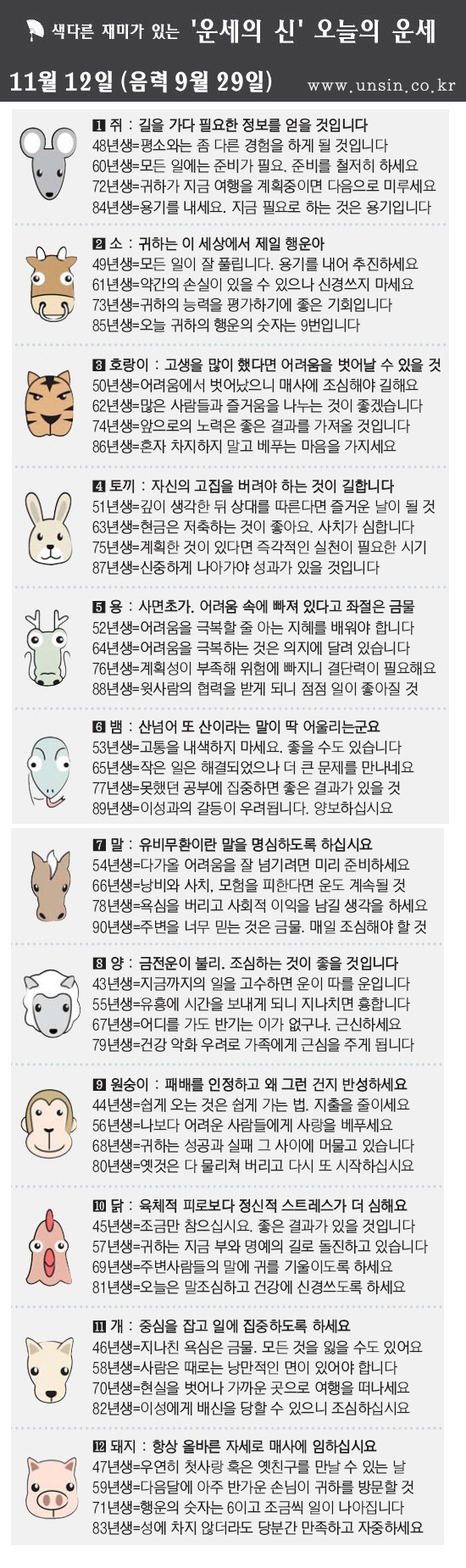 [띠별 오늘의 운세] 2012년 11월 12일 월요일(음력 9월 29일)