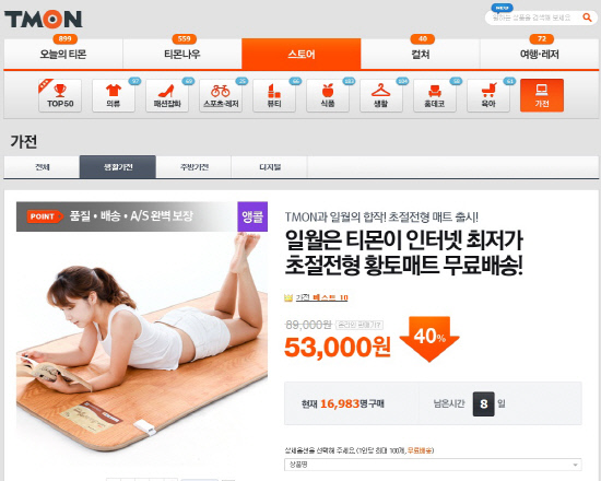 국내 대표 소셜커머스 기업 티켓몬스터가 운영하는 티몬(www.tmon.co.kr 대표 신현성)은 겨울 난방기구 및 김장철 김치냉장고 같은 시즌성 가전제품이 판매 호조를 보이며 억 단위 매출의 대박 행진을 하고 있다고 12일 밝혔다.