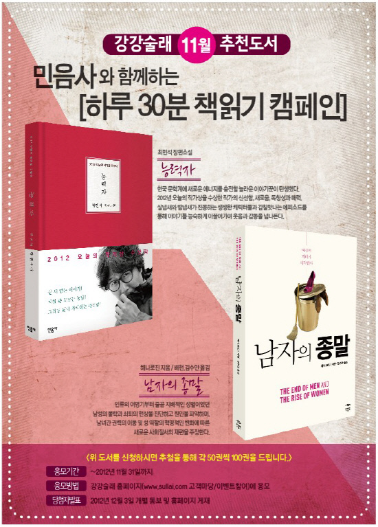 헤나로진의 '남자의 종말'은 남녀간 권력의 이동과 성역할의 변화에 따른 사회질서의 재편의 주장과 재점검하며 최민성의 장편소설 '능력자'는 신선함, 독창적인 매력을 느낄수 있고 살냄새, 땀냄새가 가득한 감칠맛 나는 에피소드로 웃음과 감동을 전하는 도서를 증정해 고객의 자투리 시간까지도 활용할 수 있도록 이벤트를 진행한다.