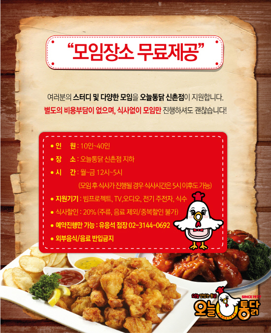35년 전통의 통닭 전문점 오늘통닭(대표 손영순·www.ohnuldak.co.kr)이 신촌점의 지하1층을 학생들을 위한 스터디 공간으로 무료 개방한다.