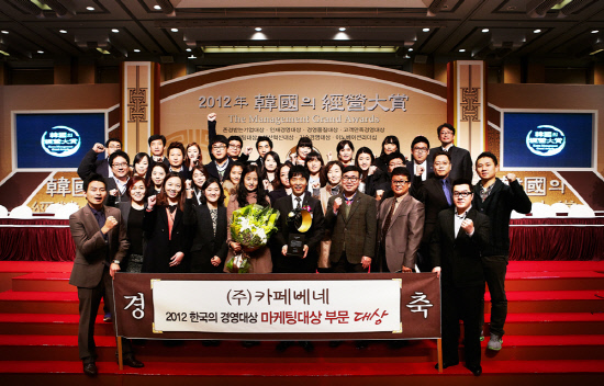 카페베네(대표 김선권)가 '2012 한국의 경영대상' 시상식에서 '마케팅대상' 부문 대상을 수상했다. 한국능률협회컨설팅(KMAC)이 주관하는 2012 한국의 경영대상은 경영혁신을 통해 고객가치를 창출함으로써 산업발전에 기여한 기업을 선정해 시상한다.