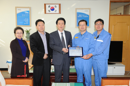 | ◇사진왼쪽부터 이선희선생님, 김길수 교감선생님, 강수일 교장선생님, 김건중 환경보건그룹 건강증진팀리더, 유성종 화성부 조업개선팀리더 |