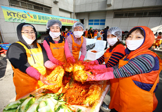 전국 36곳에서 릴레이식으로 펼쳐지는 이번 행사에는 대학생들로 구성된 'KT&G 상상발런티어 봉사단' 및 KT&G 임직원 '상상투게더 봉사단'과 각 지역별 자원봉사자 등이 참여한다. 이들이 담근 김장 김치는 저소득가정 등 3만 7000여세대와 251개 사회복지시설에 전달된다.