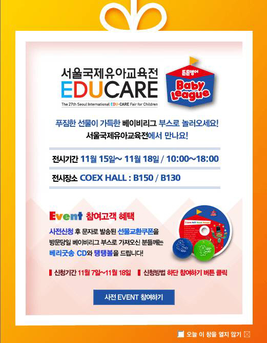 ㈜튼튼영어 부스 현장에는 학부모와 아이들의 활발한 방문 유도를 위한 다양한 이벤트가 준비되어 있다. 튼튼영어 홈페이지(www.tuntun.com)에서 사전이벤트를 신청한 5~7세 아이들 및 학부모에게는 2013년 캘린더와 '튼튼영어주니어' 체험교재를, 영유아 영어놀이프로그램인 베이비리그 홈페이지(www.ebabyleague.com)에서 사전이벤트를 신청한 4세 미만 아동의 부모에게는 베리굿송CD와 탱탱볼을 증정한다. 또한 부스에서 영어교육 상담을 받은 모든 고객에게 자녀 연령대에 맞는 체험교재와 CD, 초대형 부직포 가방을 제공한다.