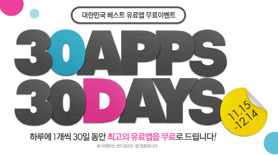 NHN㈜이 15일부터 다음달 14일까지 '네이버 앱스토어'를 통해 안드로이드 이용자들이 매일 한 가지의 유료앱을 무료로 다운로드 받을 수 있는 이벤트 '30APPs, 30DAYs'를 시작한다. 이용자들은 매일 오전 11시부터 오후 11시까지 12시간 동안 '네이버 앱스토어' 애플리케이션을 통해 무료 다운로드의 혜택을 누릴 수 있다. 네이버는 이용자들이 무료 다운로드의 혜택을 고르게 누릴 수 있도록 게임, 어학, 생산성, 교육, 만화 등 다양한 분야의 애플리케이션으로 라인업을 갖췄다. 더욱이 이번에 선택된 30개의 앱은 기존 안드로이드 앱마켓에서 큰 인기를 누리고 있는 유료앱들로, 리얼레이싱2와 팔라독과 같은 인기 게임이나 1만9900원의 브리태니커 백과사전과 같은고가의 앱이 포함되어 있다. 30개의 앱 모두를 구매한다고 가정할 경우 비용은 13만원 가량이다.