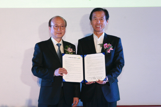 | ◇AK플라자-강원도 MOU체결. 서광준 AK플라자 대표이사(왼쪽)와 최문순 강원도지사. 사진 제공=AK플라자 |