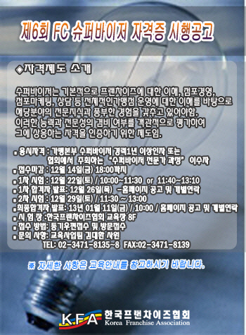 한국프랜차이즈협회가 오는 12월 22일 협회 교육장에서 가맹본부 슈퍼바이저 및 슈퍼바이저에 관심 있는 자를 대상으로 제6회 슈퍼바이저 자격증 시험을 실시한다.