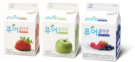 '퓨어콜라겐'은 콜라겐 500mg와 장 건강에 도움을 줄 수 있는 LGG 유산균을 함유하고 있는 우유팩 형태의 무첨가 요구르트이다. 특히 퓨어콜라겐은 시중 제품보다 칼로리는 낮추고 기능성과 맛 두 마리 토끼를 모두 잡아, 출시와 동시에 여성 소비자들을 중심으로 큰 호응을 얻고 있다. 딸기, 사과, 베리믹스 3가지 맛. 310ml, 1,600원.