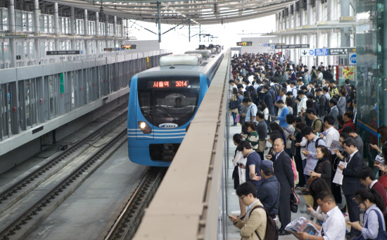 ◇공항철도가 수도권 전철과의 연계기능을 제대로 수행하는 것으로 나타났다. 출근시간 계양역 모습.