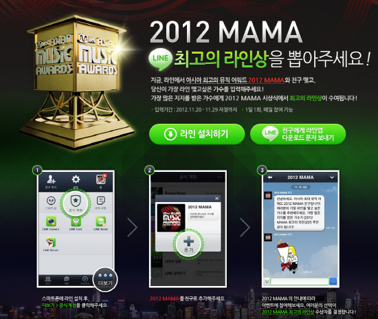 NHN Japan의 글로벌 모바일 메신저 '라인(LINE)'이 아시아 최대 규모의 음악시상식인 '2012 엠넷 아시안 뮤직 어워드(Mnet Asian Music Awards, 이하 MAMA)를 후원한다. 21일 현재 전세계 가입자수 7600만명을 돌파한 라인은 11월 30일 홍콩 컨벤션&익스히비션 센터에서 열리는 2012 MAMA 후원을 통해 다양한 온오프라인 프로모션을 진행하고 아시아 지역의 라인 이용자들에게 즐거움을 선사할 것으로 보인다.