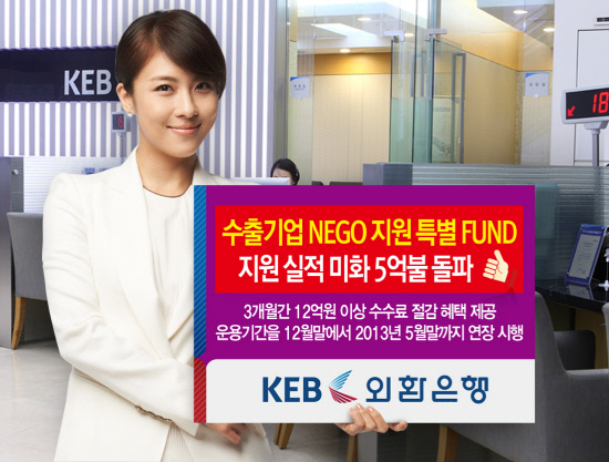 외환은행(은행장 윤용로/www.keb.co.kr)은 정책당국의 정책에 부응하고 글로벌 경기침체로 어려움을 겪고 있는 수출기업을 위해 시행한 '수출기업 NEGO지원 특별 FUND' 지원 실적이 약 3개월 만에 미화 5억달러를 초과했다고 21일 밝혔다.