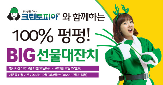 세탁 프랜차이즈 크린토피아(www.cleantopia.com)가 22일부터 12월 22일까지 30일간 '크린토피아 BIG 선물 대잔치' 이벤트를 진행한다.