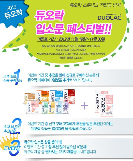 '듀오락 입소문 페스티벌'은 추천을 받아 신규 구매한 고객에게는 '듀오락ATP' 3일분을 추가 증정하며, 기존 고객인 추천인에게는 파격적으로 1만원을 적립해주는 행사다.