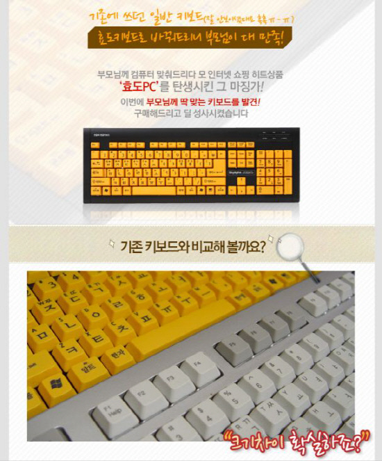 효도키보드란 기존 데스크탑 PC의 키보드 대비 약 2,3배 더 커진 자판의 활자가 새겨진 키보드다. 기존 키보드의 자판 크기는 똑같아도 'ㄱ, ㄷ, ㅓ, ㅑ' 등의 한글 기호가 한눈에 들어오게 커져있는 것이 특징.
