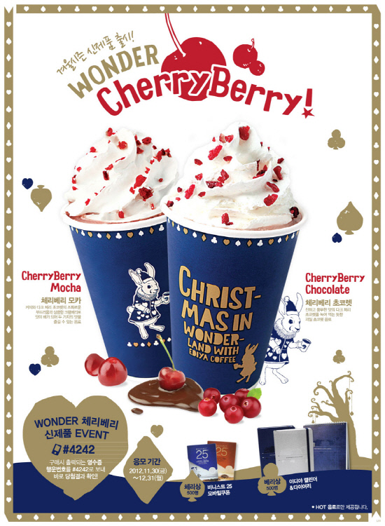 이디야 커피는 신메뉴 출시와 함께 크리스마스 시즌을 겨냥해 원더랜드라는 콘셉을 바탕으로 한 컵과 컵 홀더를 이디야만의 전통색인 파란색과 크리스마스 분위기가 물씬 풍기는 이미지들을 구성해 소비자들이 최상의 커피 맛과 함께 눈으로 즐기는 일석이조의 만족감을 줄 것으로 기대된다.