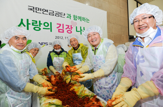 국민연금공단(이사장 전광우)은 28일 오후 서울 잠실에 있는 공단본부에서 자매결연마을 주민과 공단이사장을 비롯한 임직원 180여명 등 총 200여명이 참석한 가운데 '사랑의 김장김치 나눔 행사'를 가졌다.