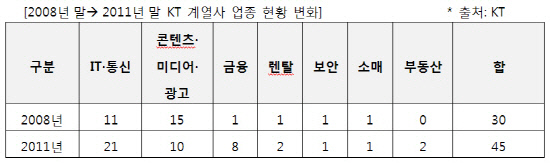 2008년 말 141억 원이었던 KT 계열사 당기순이익은 2011년 말에는 2,501억 원을 기록했다. 3년 만에 계열사 당기순이익이 1673%로 증가한 것이다.