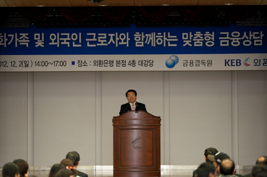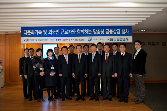 외환은행(은행장 윤용로/www.keb.co.kr)은 금융감독원(원장 권혁세/www.fss.or.kr)과 공동으로 서울 을지로 외환은행 본점 대강당에서 맞춤형 서민금융 행사의 일환으로 국내에 거주하는 다문화가정 및 외국인근로자들의 금융거래시 애로사항을 해소하고자 '다문화가정 및 외국인근로자 대상 금융상담 행사'를 개최했다고 2일 밝혔다.