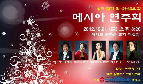 겨울밤의 선율을 보여줄 메시아 연주회가 여의도순복음교회 나사렛 성가대의 목소리로 오는 21일 금요일 저녁 8시 20분 여의도순복음교회 대성전에서 열린다.