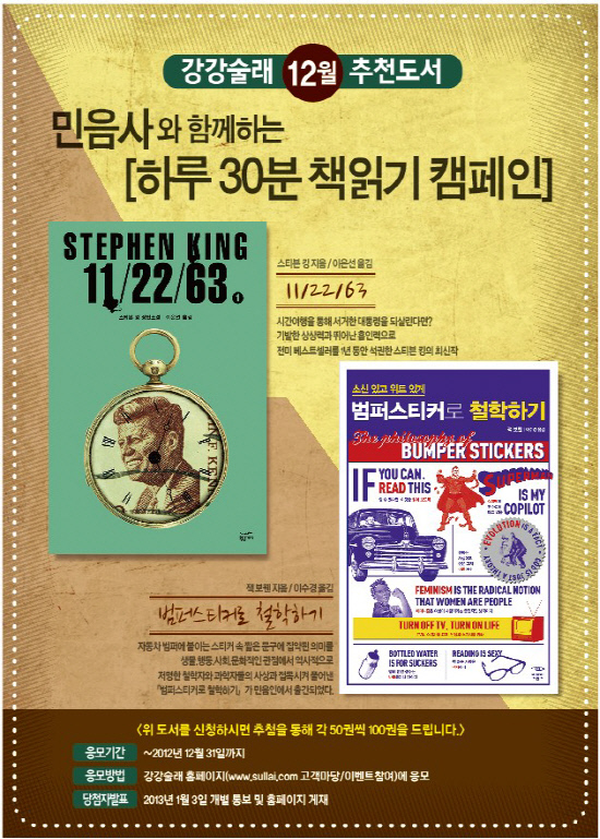 이달 31일까지 진행하는 강강술래 도서이벤트는 홈페이지(www.sullai.com)의 고객마당(이벤트 참여)에 글을 남기면 추첨을 통해 각 50권씩(총 100명)에게 스티븐 킹의 '11/22/63'과 잭 보웬의 '소신 있고 위트 있게 범퍼스티커로 철학하기'를 증정한다.