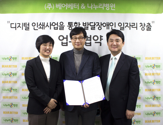 아름다운 재단이 선정한 '나눔병원 1호'인 나누리병원(이사장 장일태)이 발달장애인 고용기업 베어베터(대표 이진희 김정호)와 지난 4일 뜻깊은 업무협약을 체결했다.