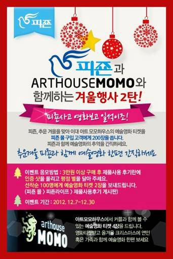 새로워진 피죤의 홈페이지를 방문해 피죤의 고농축 섬유유연제 '울트라 피죤' 등을 3만원 이상 구매한 고객 중 100명에게 이화여대 예술영화 전용관 아트하우스 모모에서 관람할 수 있는 영화티켓을 증정한다.